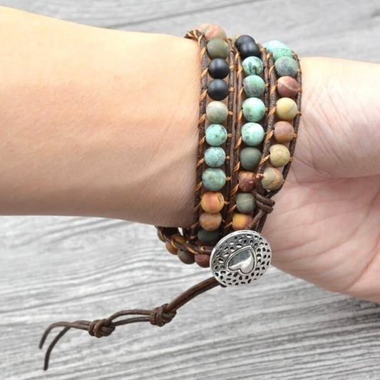 Beautiful Boho Bracelet -Beaded Leather Wrap Multi- Layered Chakra Bracelet with natural beads entwined with Leather. Friendship Bracelet