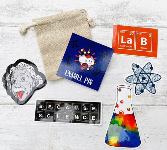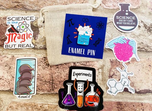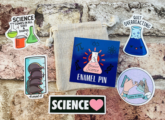 Chemistry Science Enamel Pin / University Badge & waterproof stickers for laptops! Scientist- chemist- physicist gift box