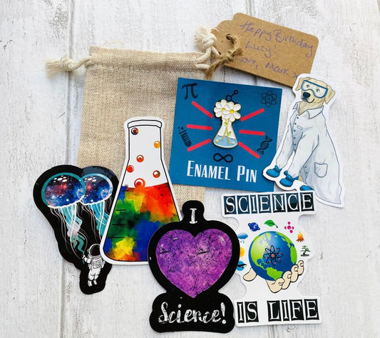 Girl Science pin- Science Flask Enamel Pin / University Badge & waterproof stickers for laptops! Scientist- chemist- physicist gift box