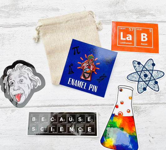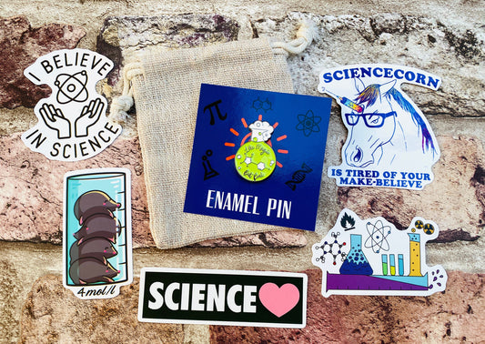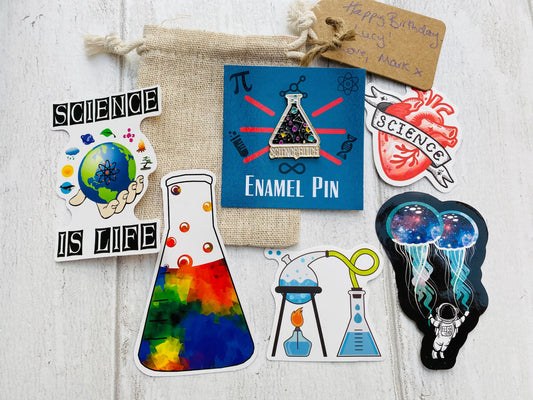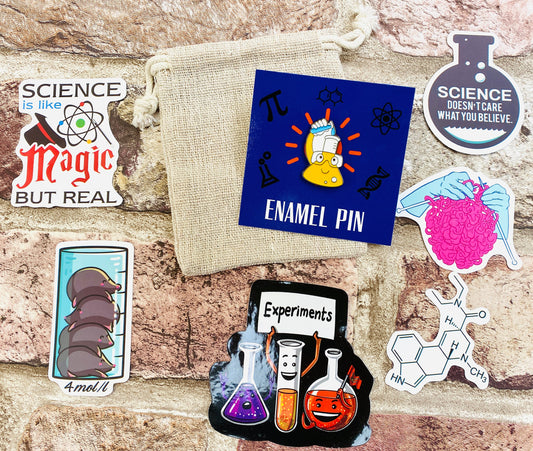 Science- Biology Enamel Pin / University Badge & waterproof stickers for laptops! Scientist- chemist- physicist gift box
