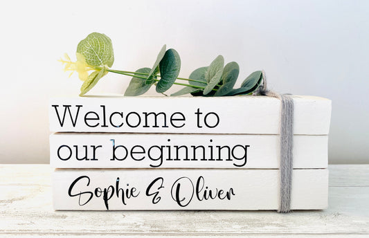 Our Beginning- Personalised White Wedding Book Stack- Wedding table decor, custom wedding decorations, Valentine’s Day Gift