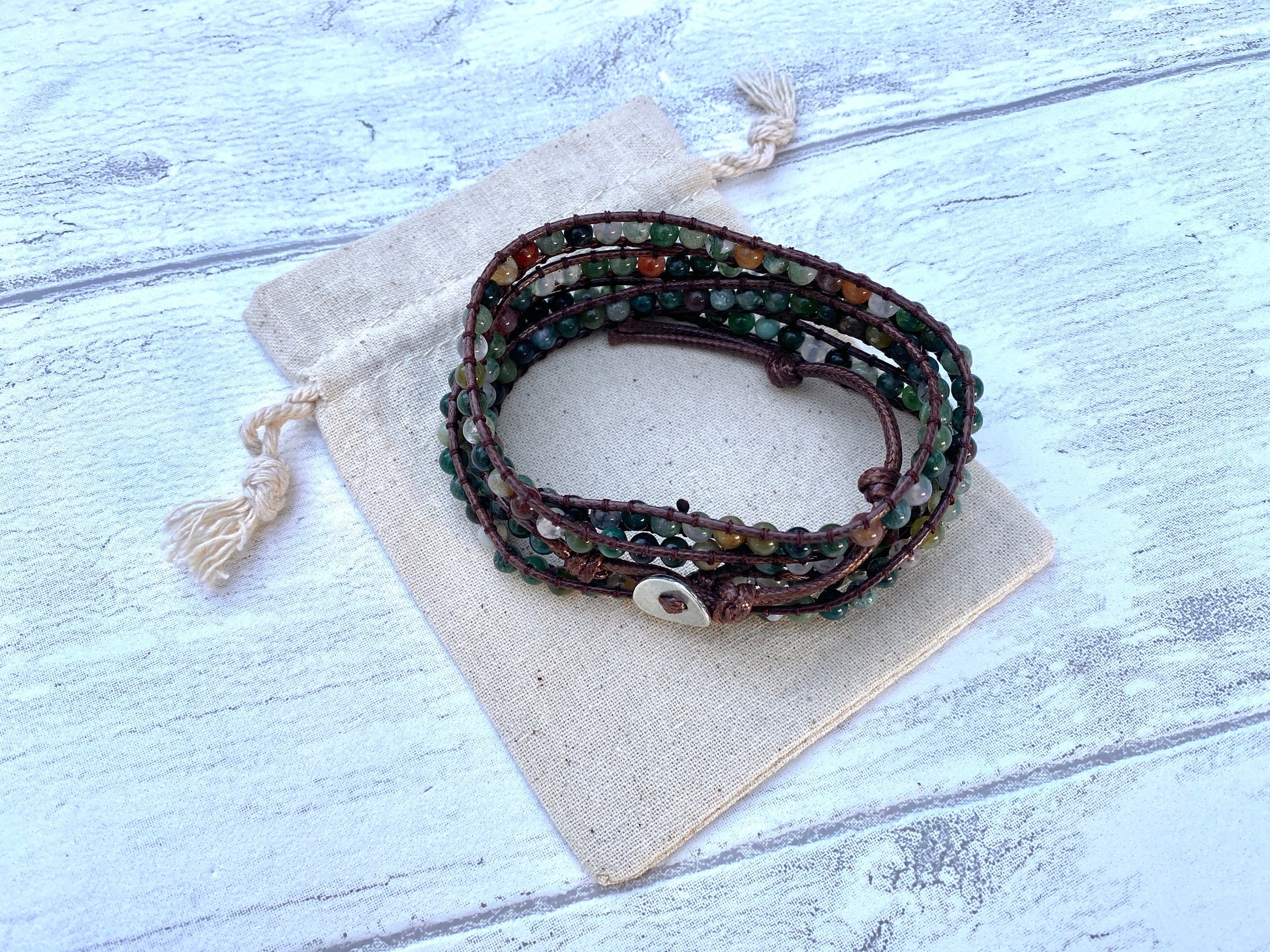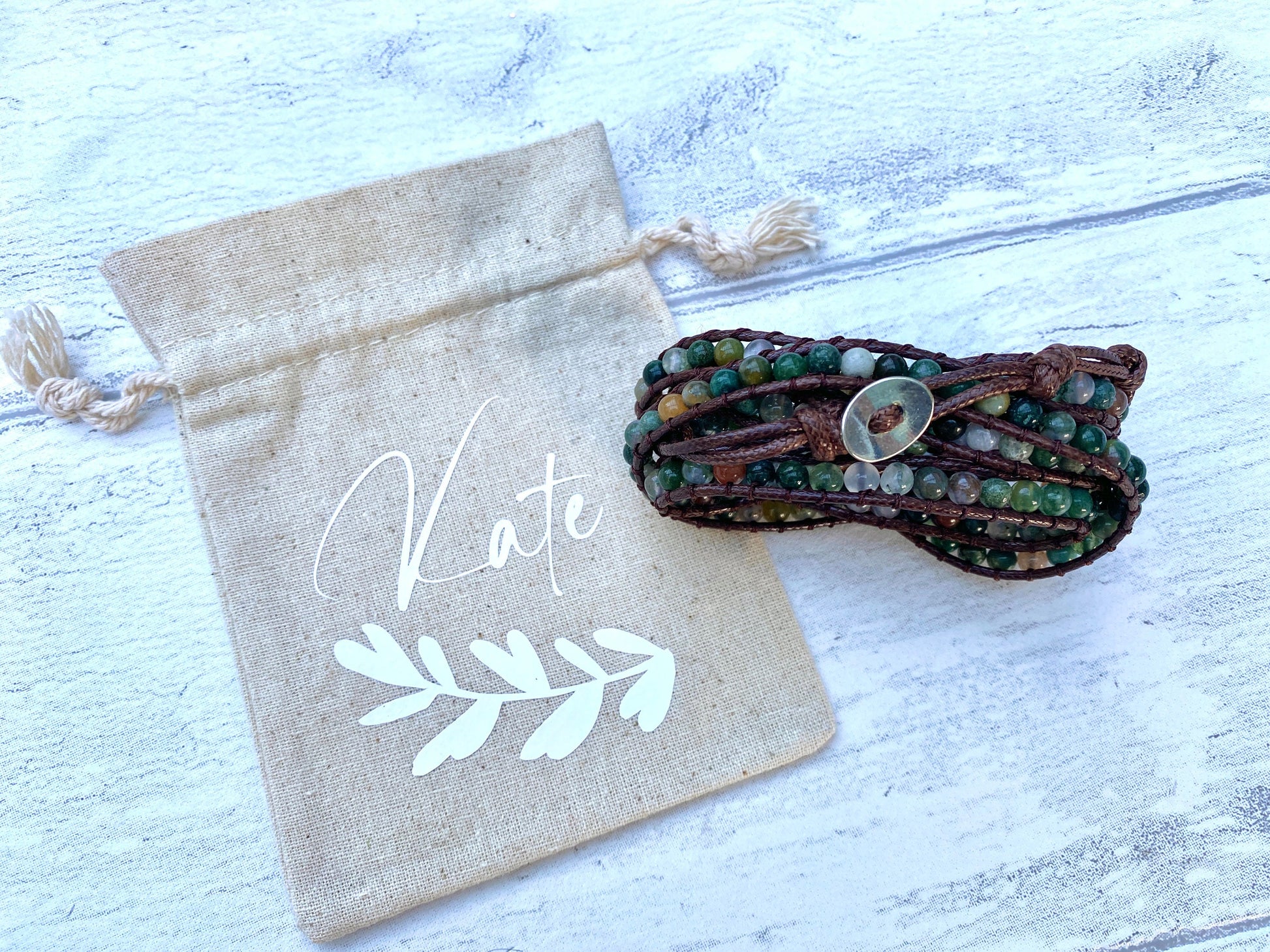The bracelet comes in a natural cotton pouch which can be left plain or personalised with a name or a few words, creating a beautiful, personalised gift for someone special.
