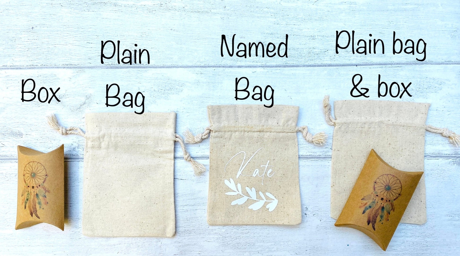 You can add a boho themed kraft gifting box to your order as well as a natural cotton pouch which can be left plain or personalised with a name or a few words, creating a beautiful, personalised gift for someone special!