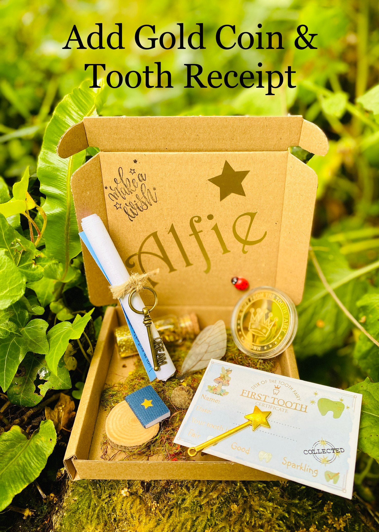 COIN-There is the option to add a large double sided Gold Coin (4cm diameter) to your box - a special gift from the Tooth Fairy to commemorate your child’s first tooth.