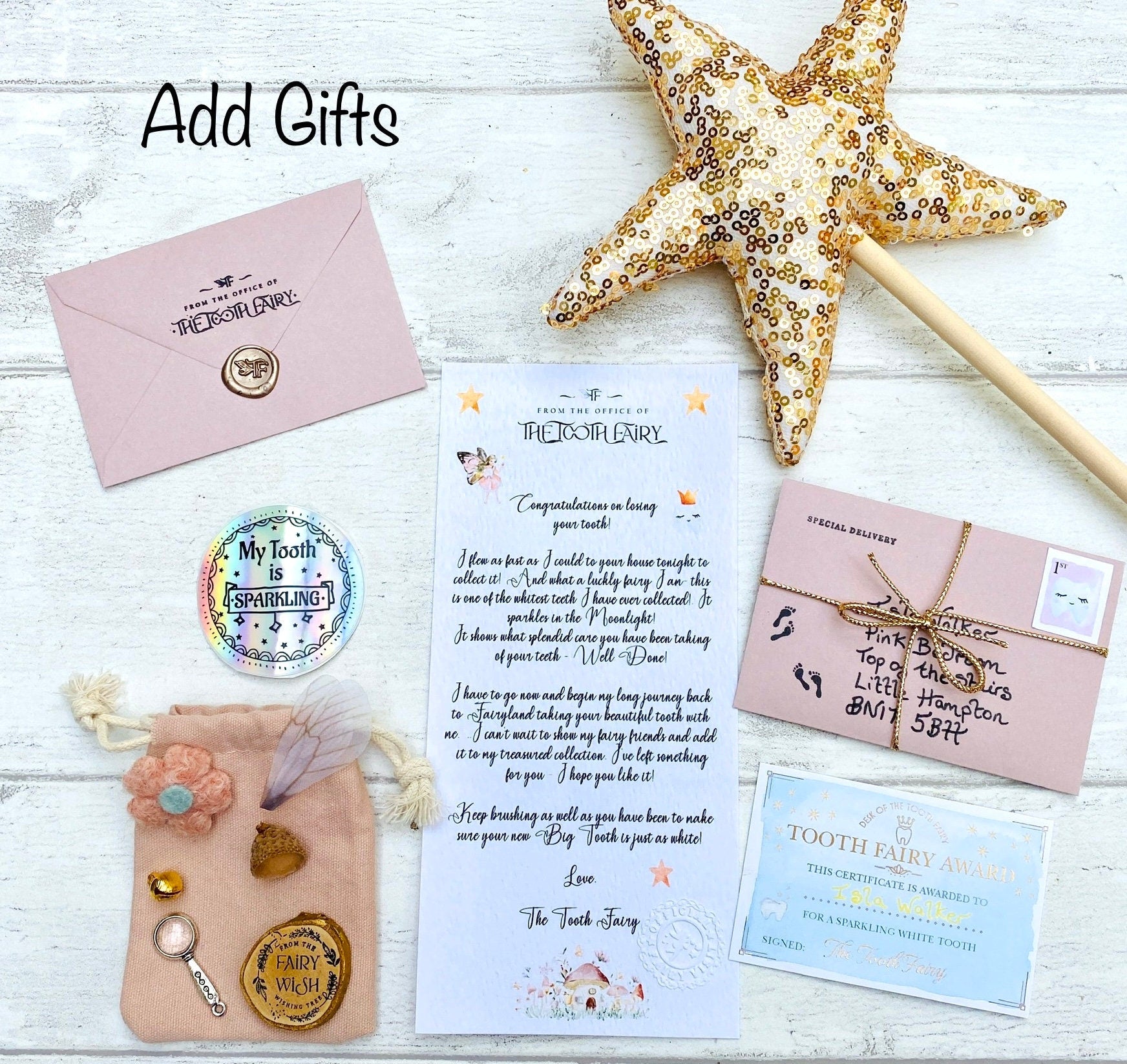 🦷GIFTS- You can also add a soft linen bag filled with special Fairy Gifts including: Fairy Wings Natural Acorn top Gold Bell Tiny Tibetan silver real Magnifying Glass A Fairy Wish- cut from Fairyland’s Wishing Tree!
