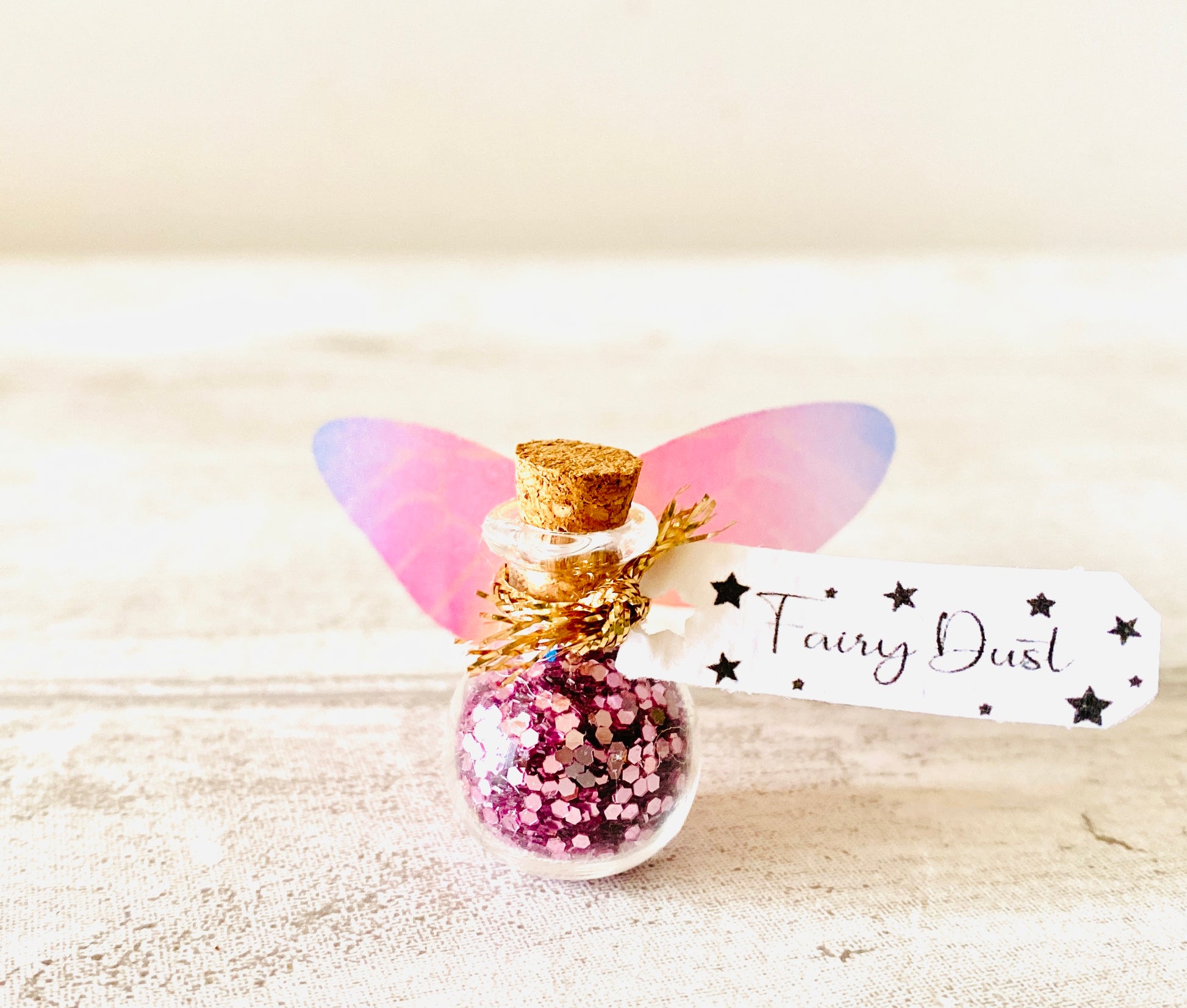 Magical mini Fairy dust glass bottles with Fairy Wings that flutter in the breeze or they can be left plain without Fairy Wings.