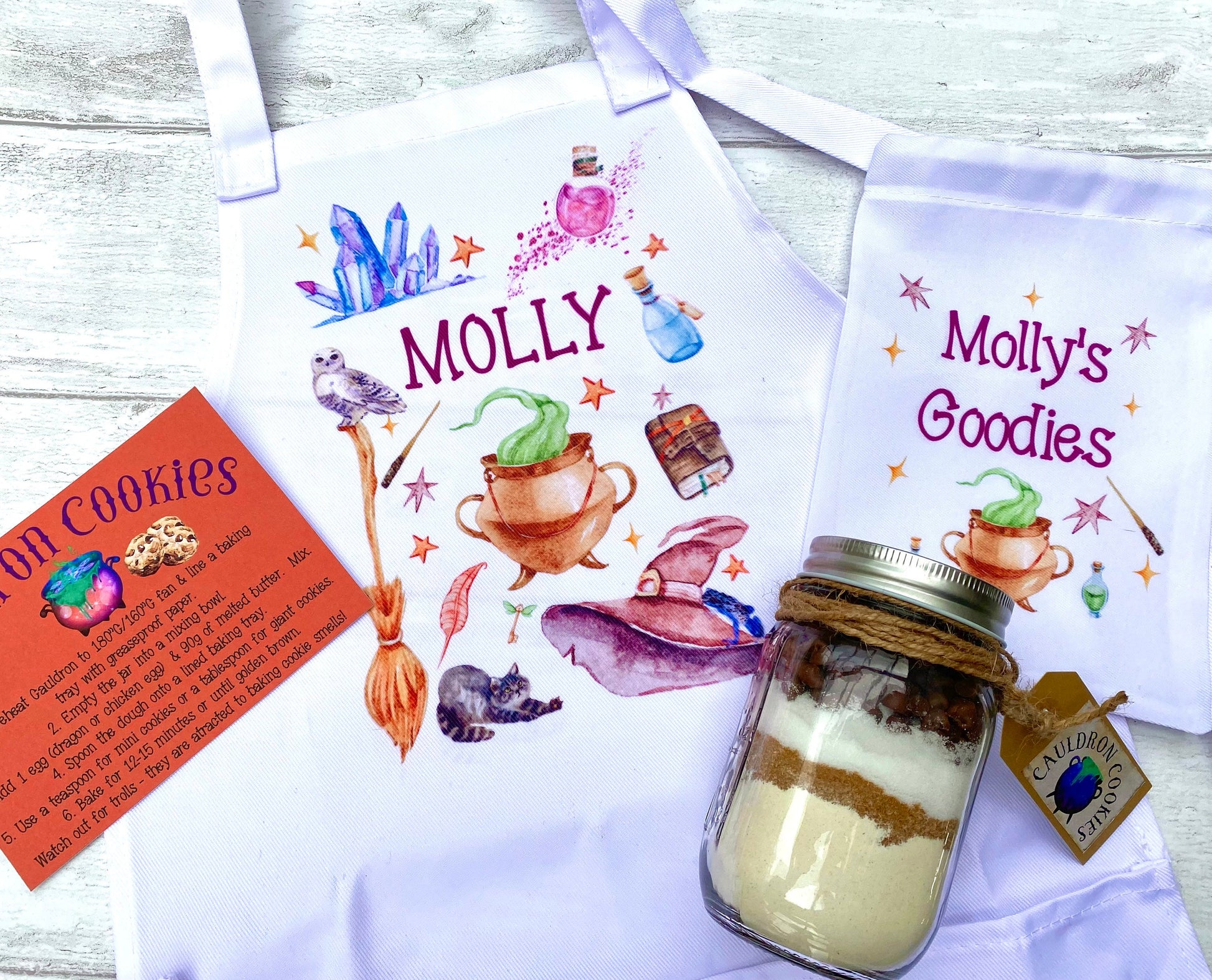 Halloween Witches & Wizards Kids Apron plus Cauldron Cookie Jar Mix! Children’s Magic Halloween Gift! Great Child Baking Set Apron Gift!