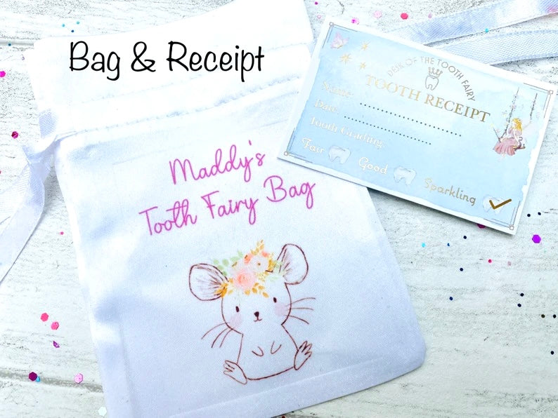 You can also add a gold foiled 1st Tooth Receipt, Tooth Receipt or Tooth Fairy Award to your child’s bag. These are professionally printed on thick card with a double-sided design making a lovely keepsake.