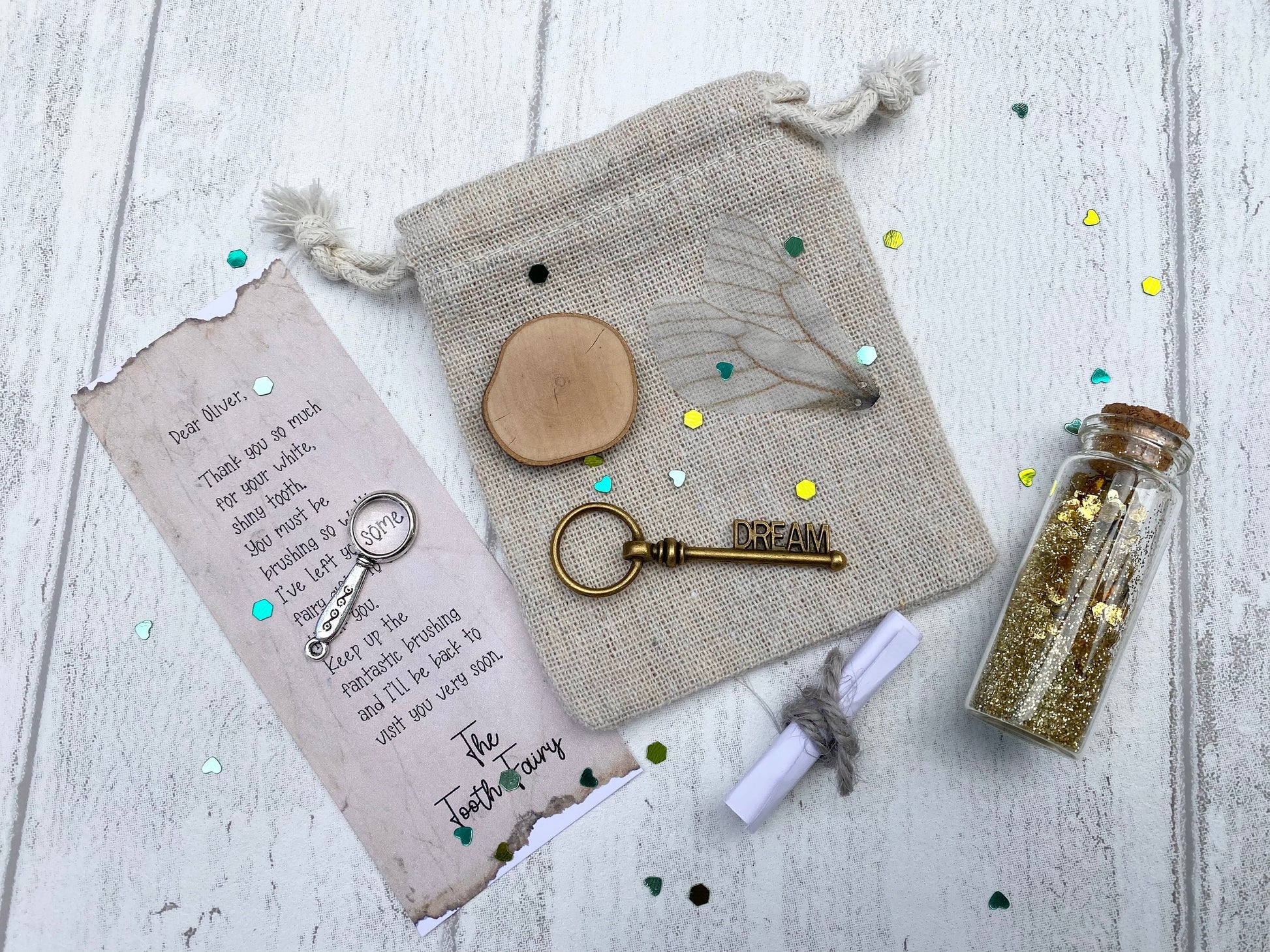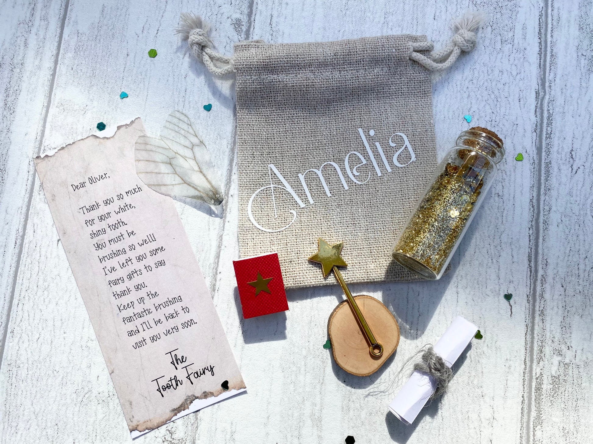 Personalised Tooth Fairy Kit- Girl’s & Boys Fairy Letter, bag with gifts, wand, fairy dust, fairy wings set