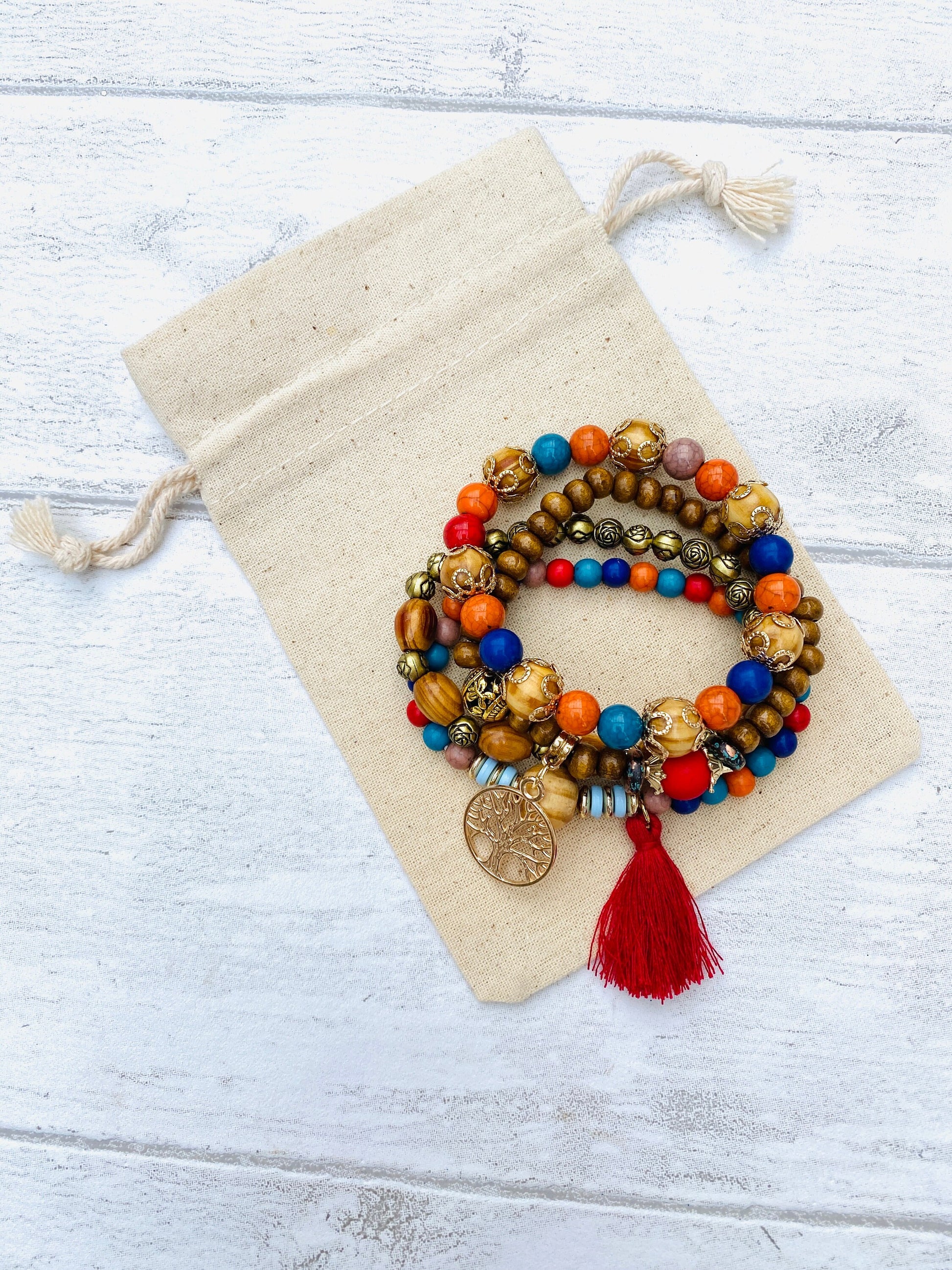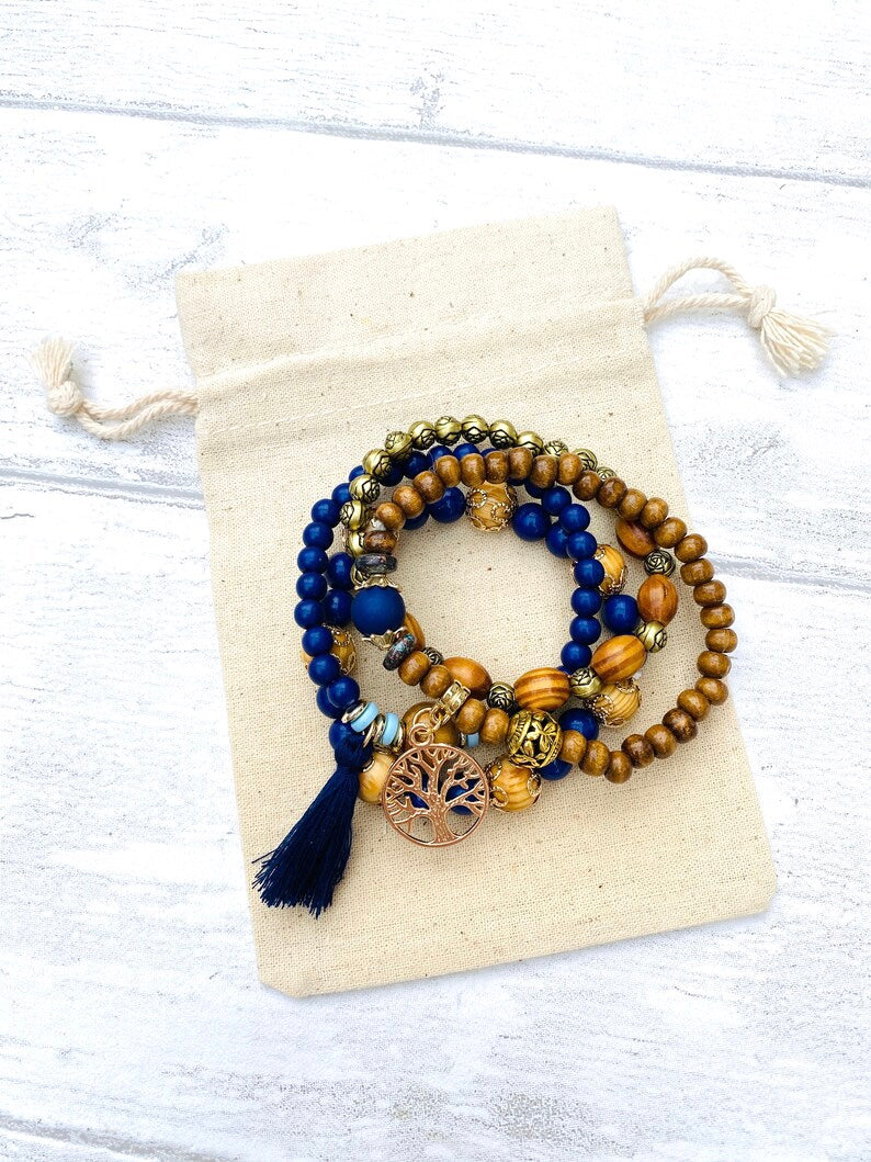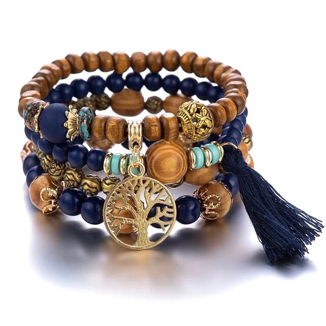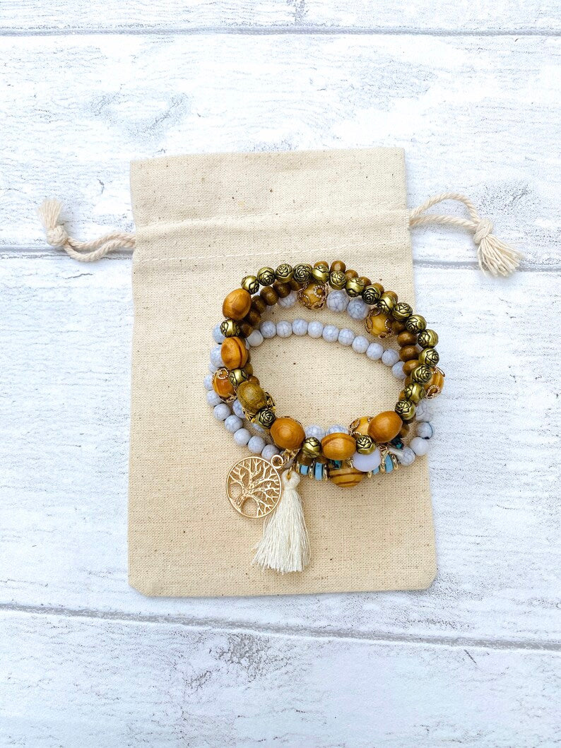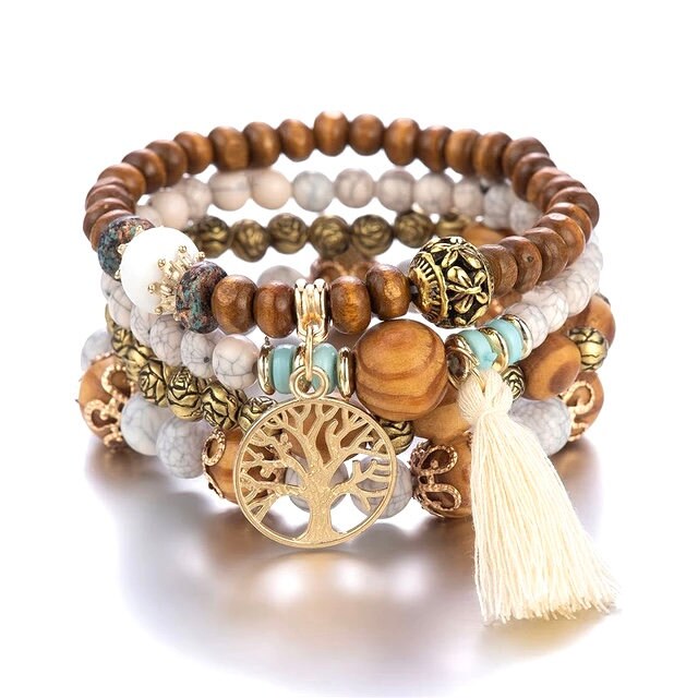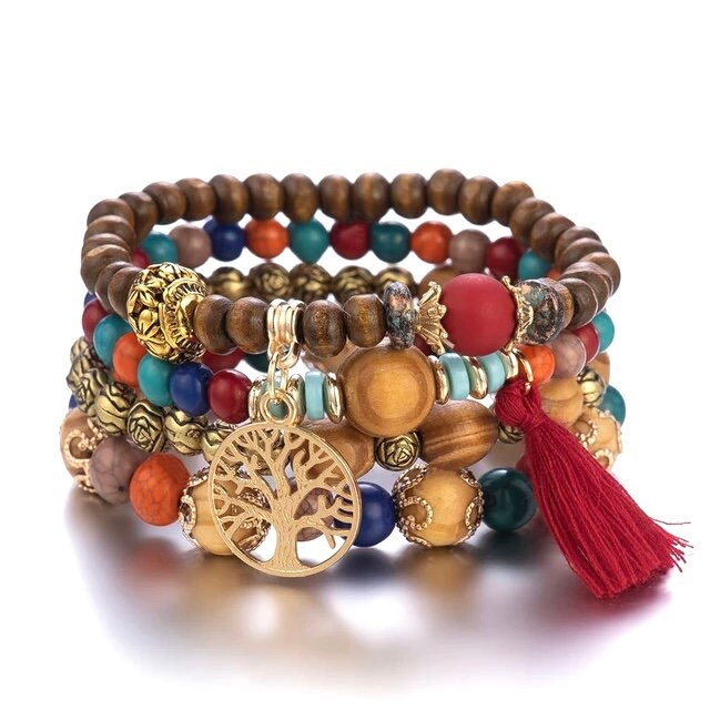 These stunning boho styled stacking bracelets have handmade wooden beads and display The Tree of Life.