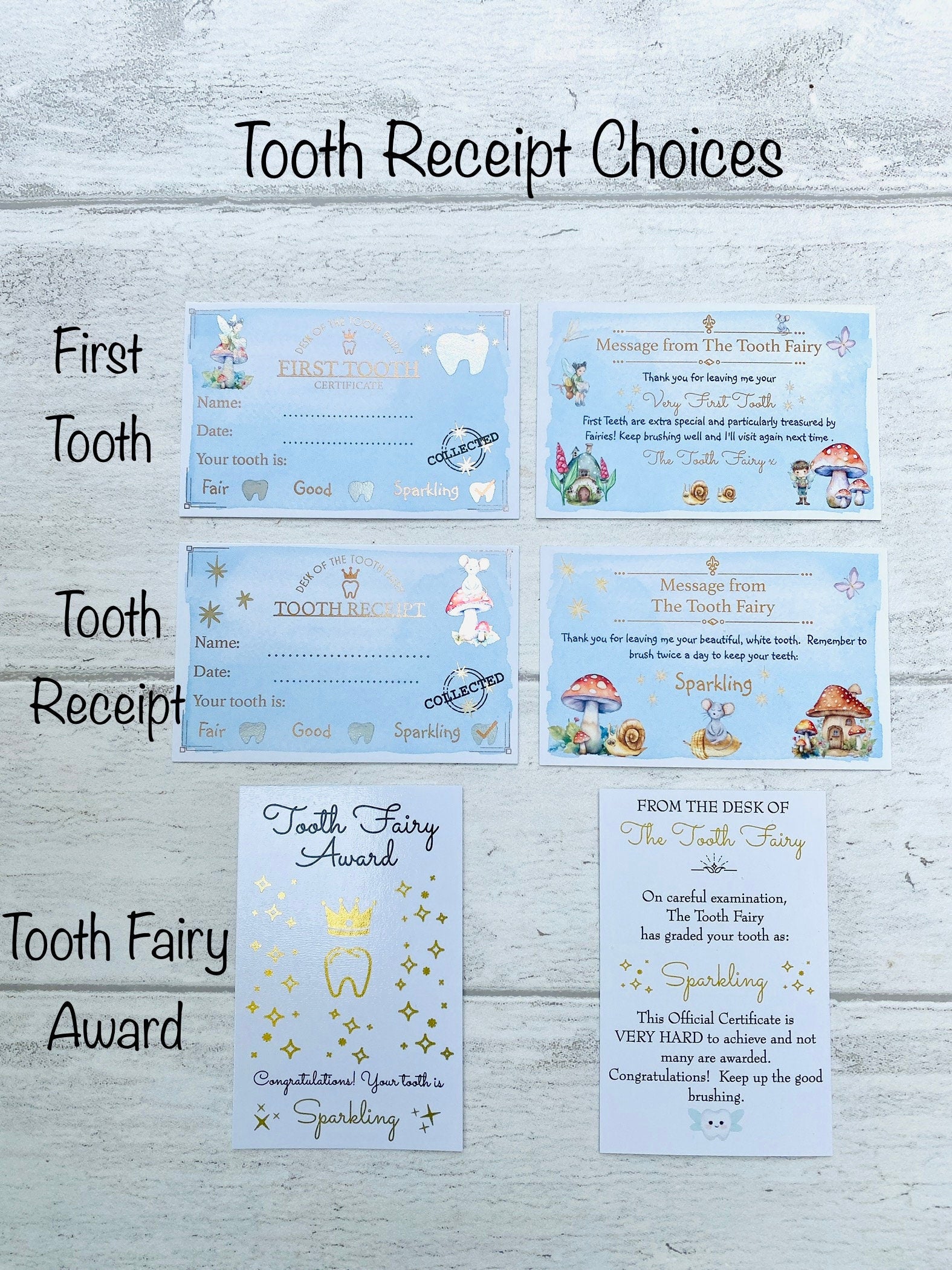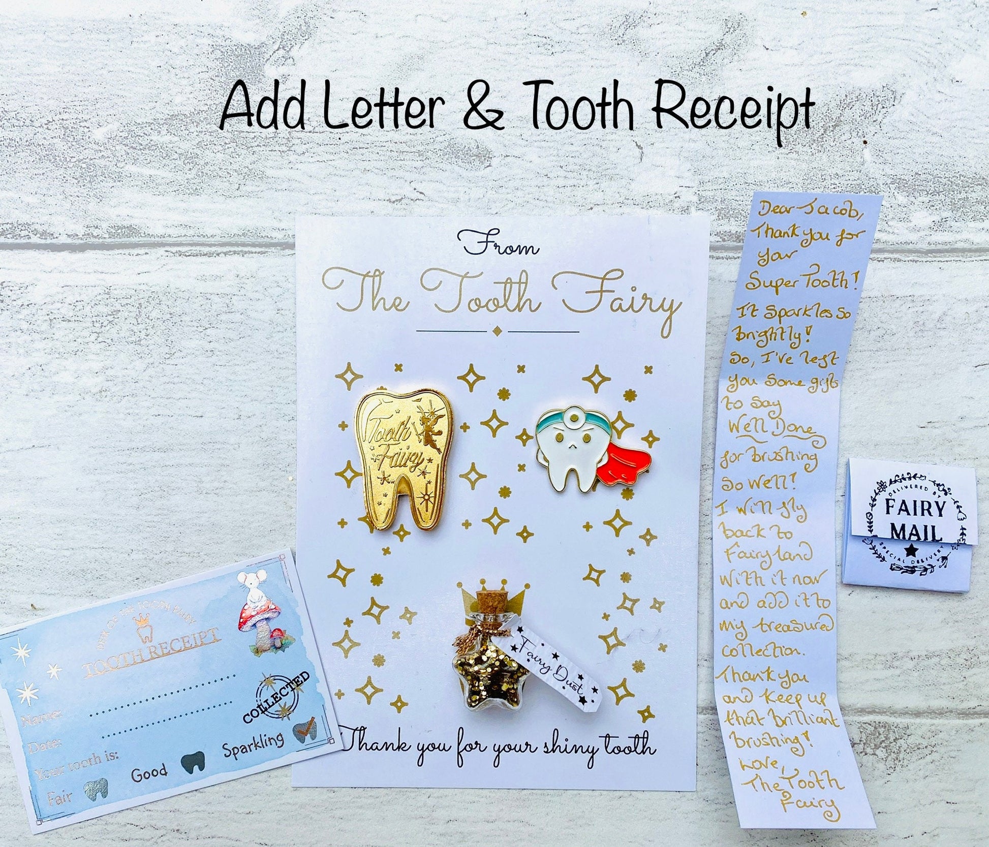 You can also add a gold-foiled Tooth Receipt in one of three designs. These are metallic so sparkle when they catch the light.