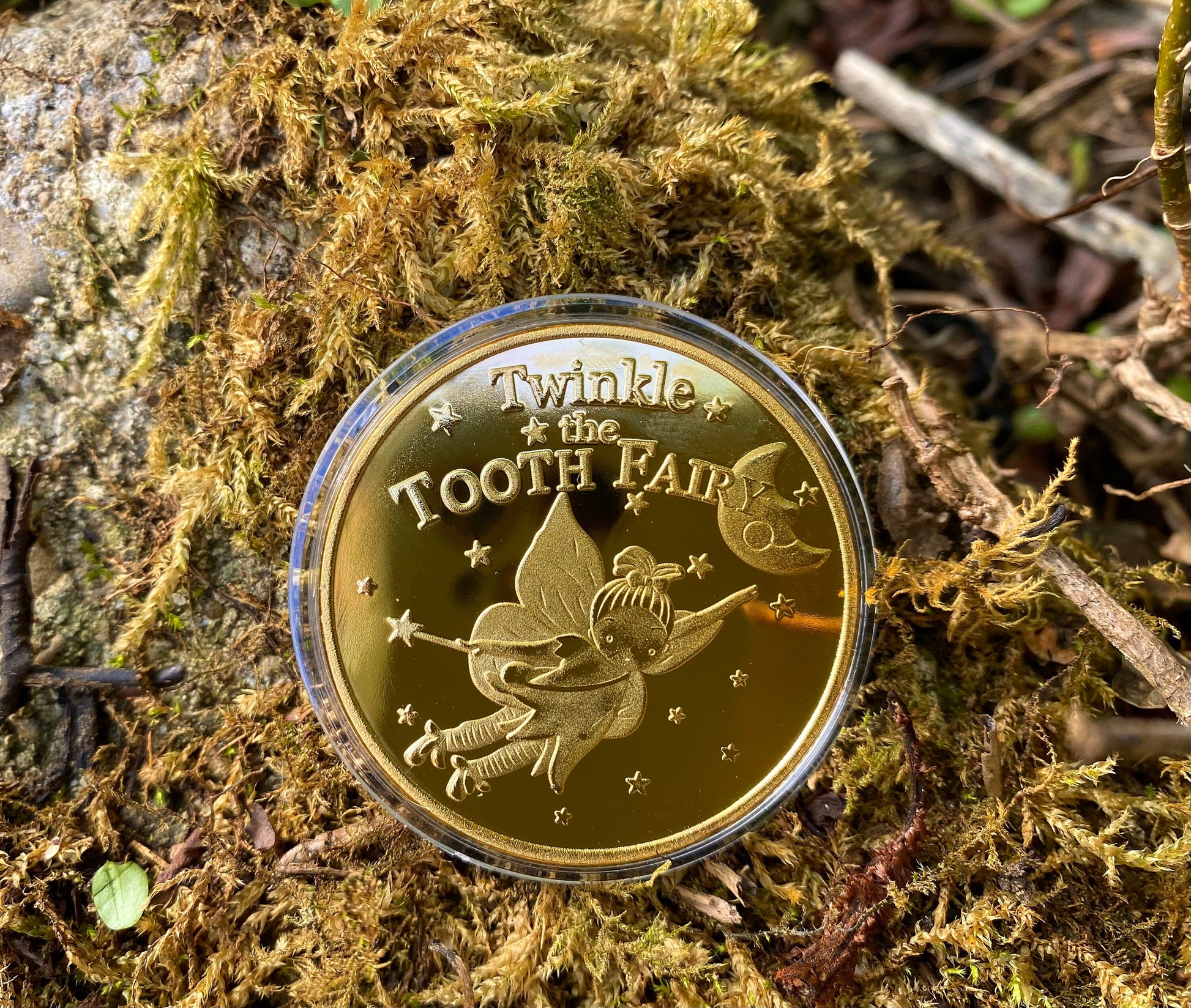COIN- You can also choose to add a double-sided large gold coin from The Tooth Fairy to your bag. This heavy gold coin is very large (4cm across) and makes a very special gift.