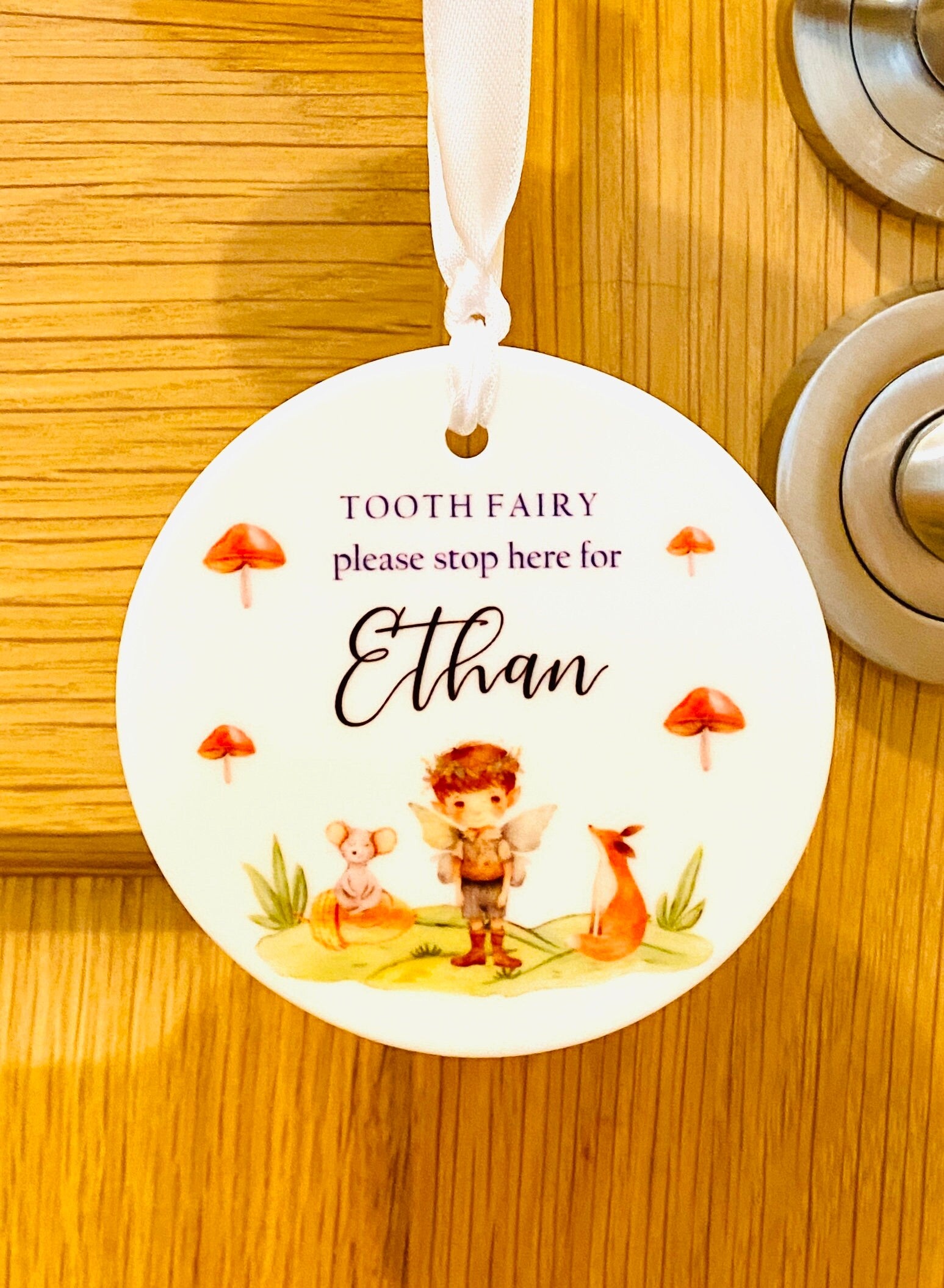 Beautiful ceramic Stop Here Tooth Fairy sign, personalised with your child’s name to hang on their door or window to let the Tooth Fairy know that there is a tooth to be collected!