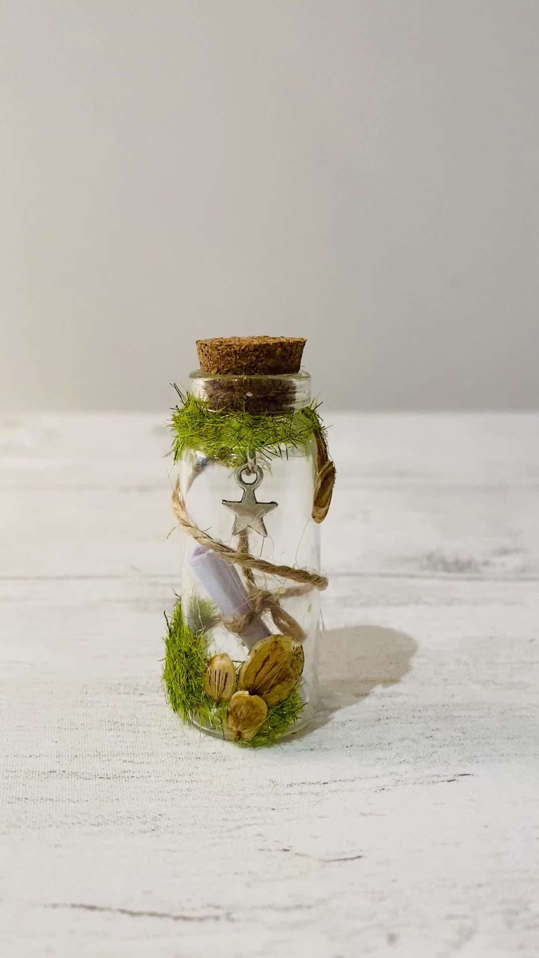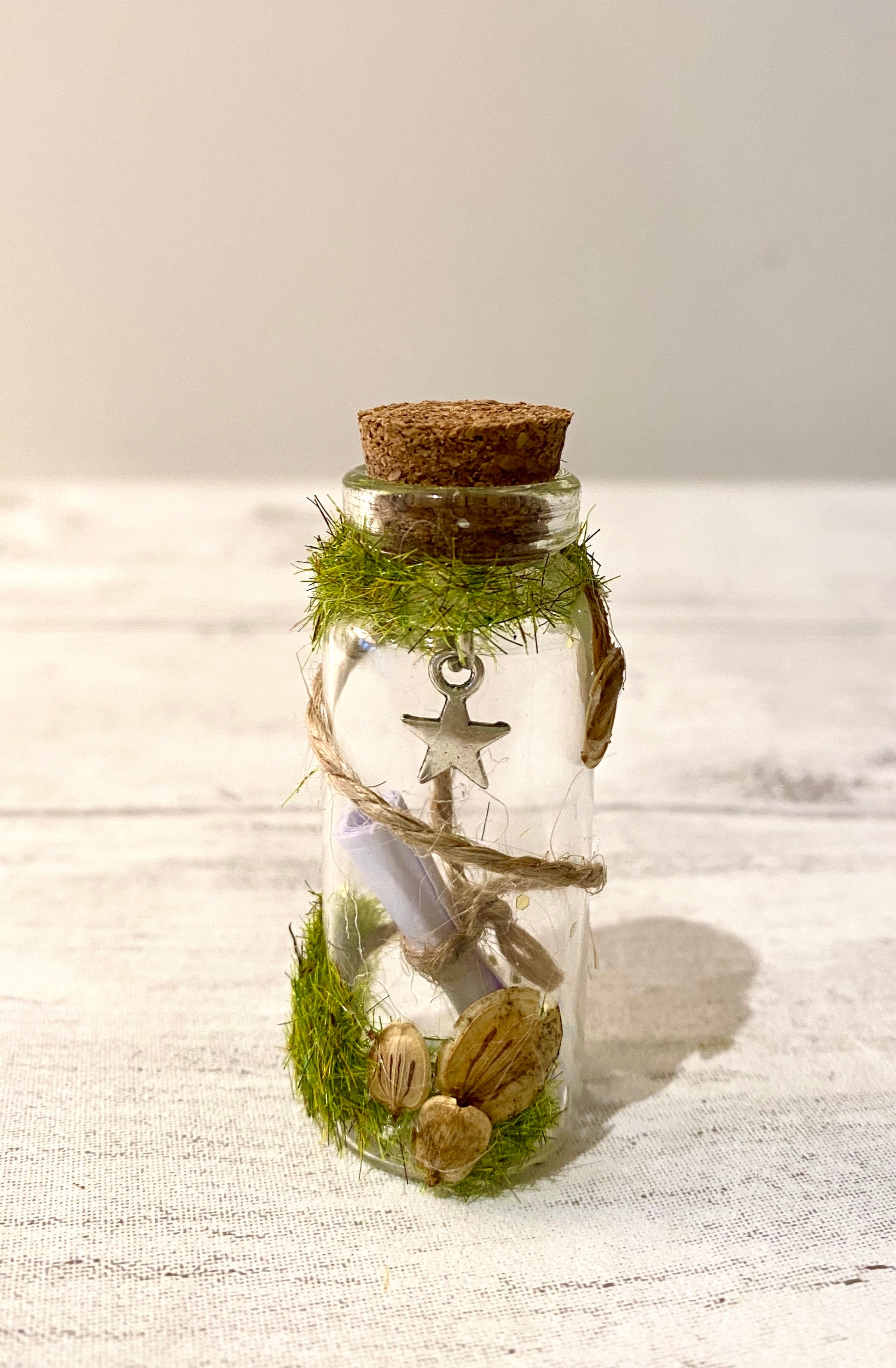 Each glass bottle is decorated in a woodland fairy style with little real woodland seeds collected locally . Inside is a letter scroll from the Tooth Fairy thanking your child for their tooth and explaining that their flight in the wind was so exhausting they had to take a rest on your child’s pillow!