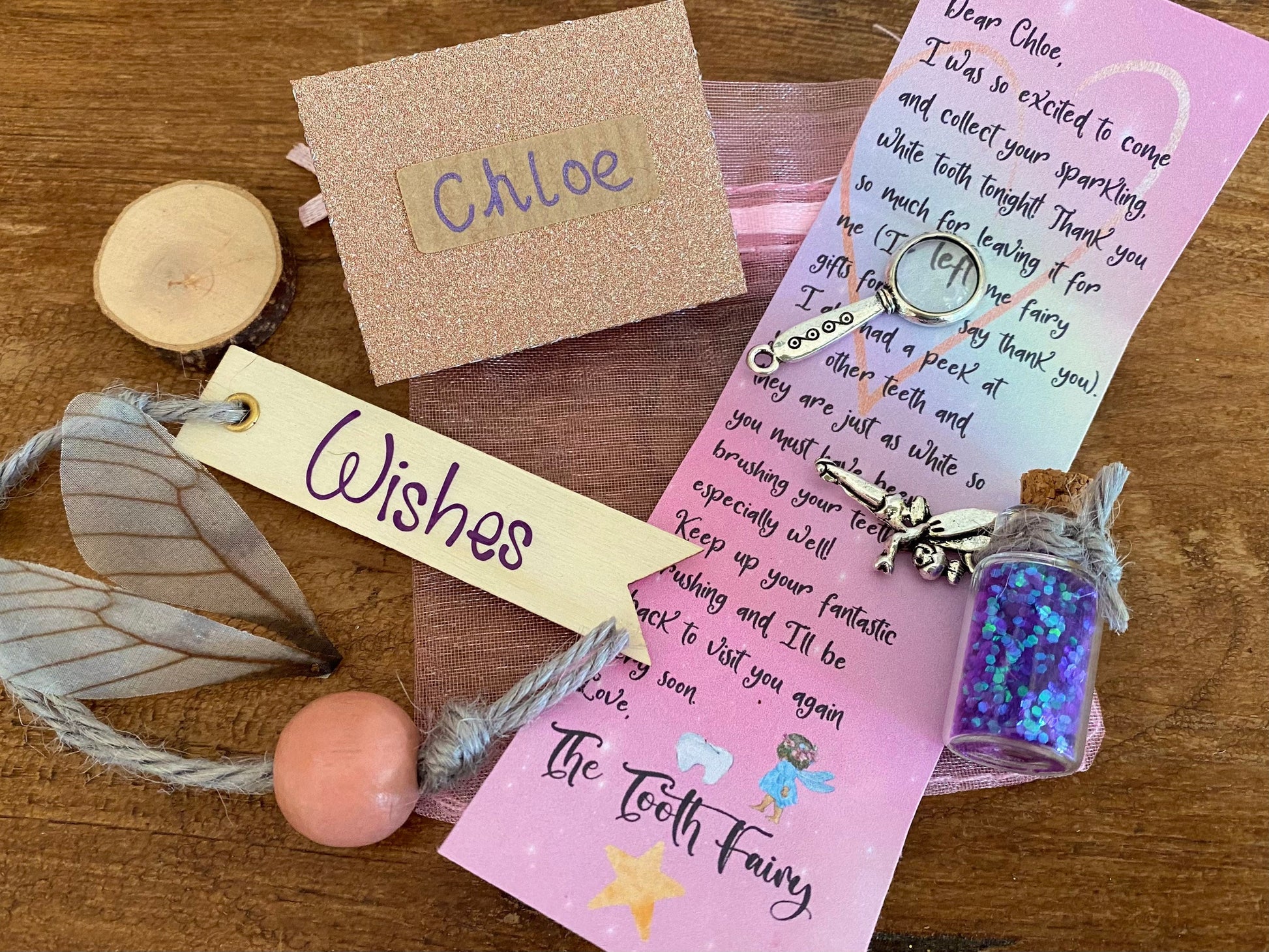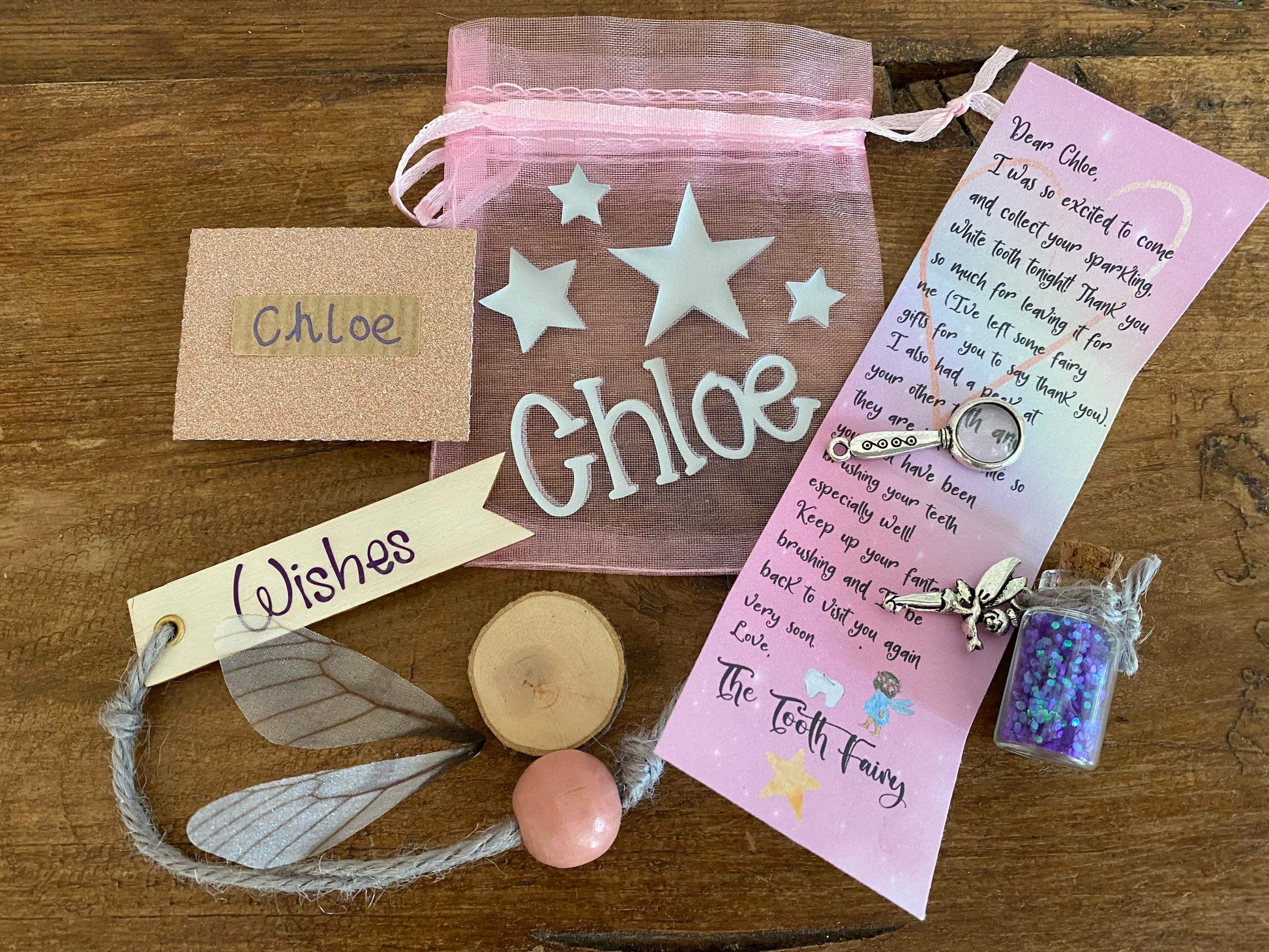 Tooth Fairy Letter & Gift Set, Personalised Fairy Letter, bag with gifts: wand, fairy dust, fairy wings and more