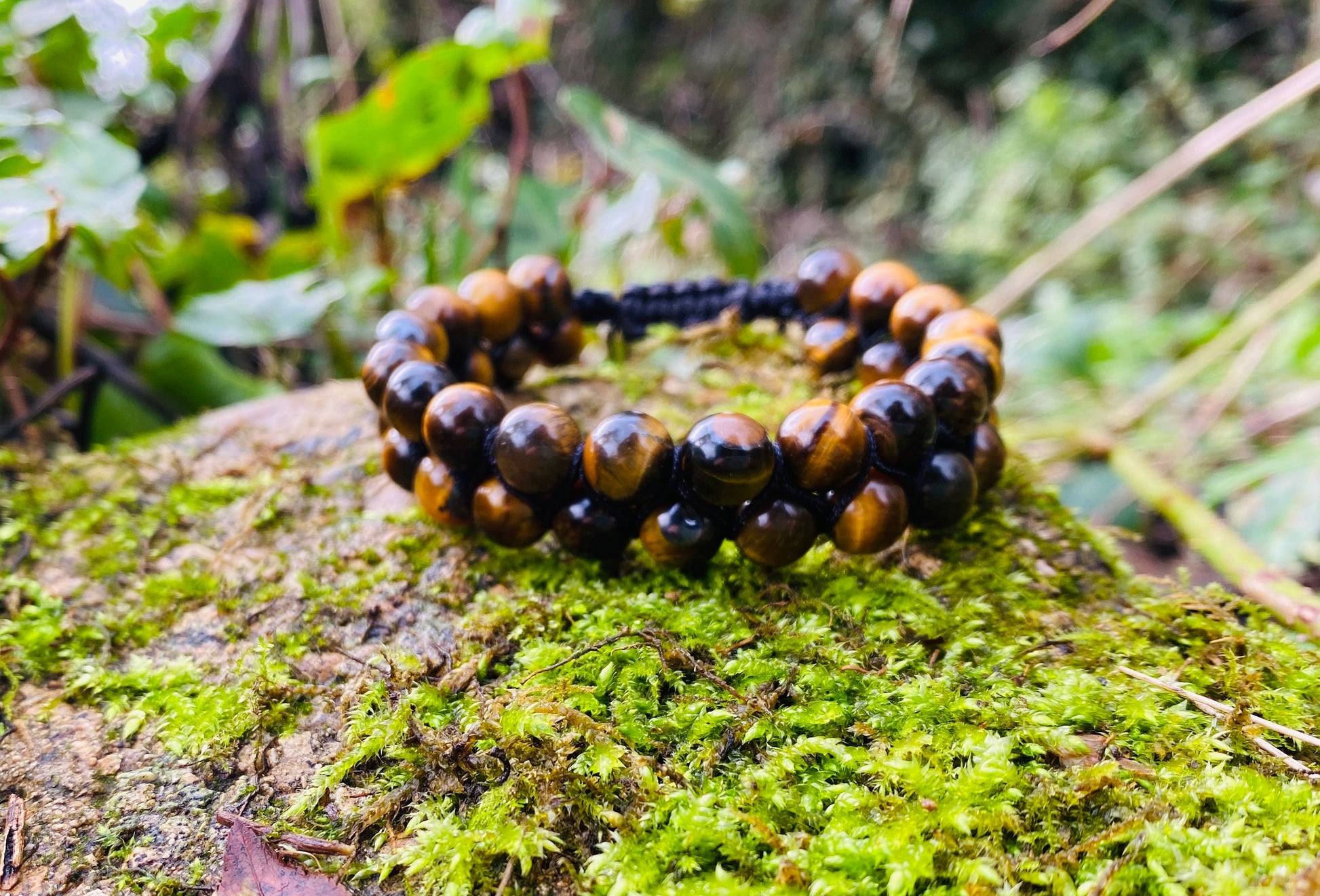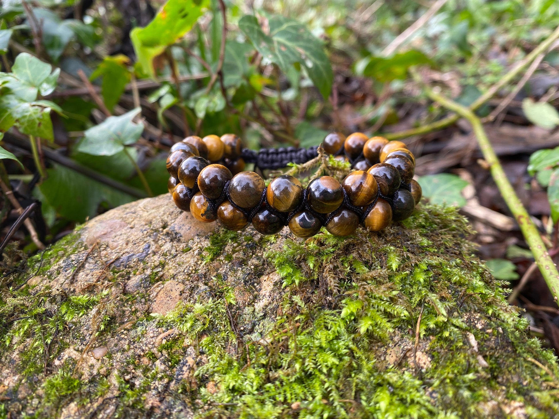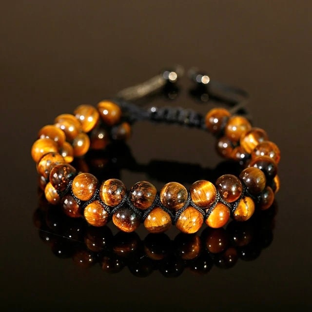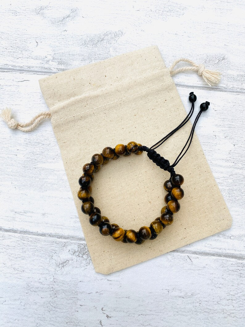 Stunningly crafted, this unisex natural Tiger’s Eye Bracelet makes a real statement with the silky hues of the Tiger’s Eye set off against the black silk twine.