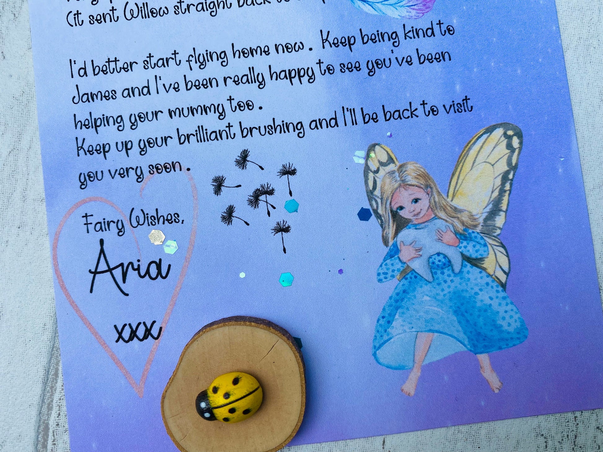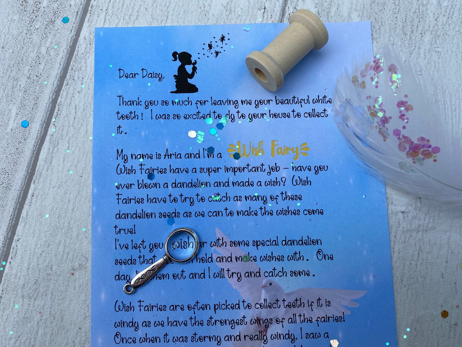 Beautiful, personalised letter from Aria- The Wish Fairy who alongside collecting teeth, helps wishes come true by catching them as they float past.