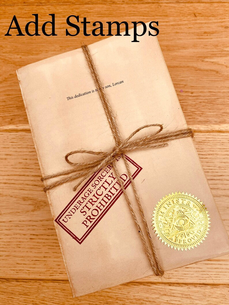 The top of each book will have a little text such as the book’s dedication and you can choose to add a GOLD MINISTRY APPROVED SEAL and an ink stamp to the top or leave it plain (please see photos). There is an option to purchase a real feather which looks very authentic when placed on top of the book stack.